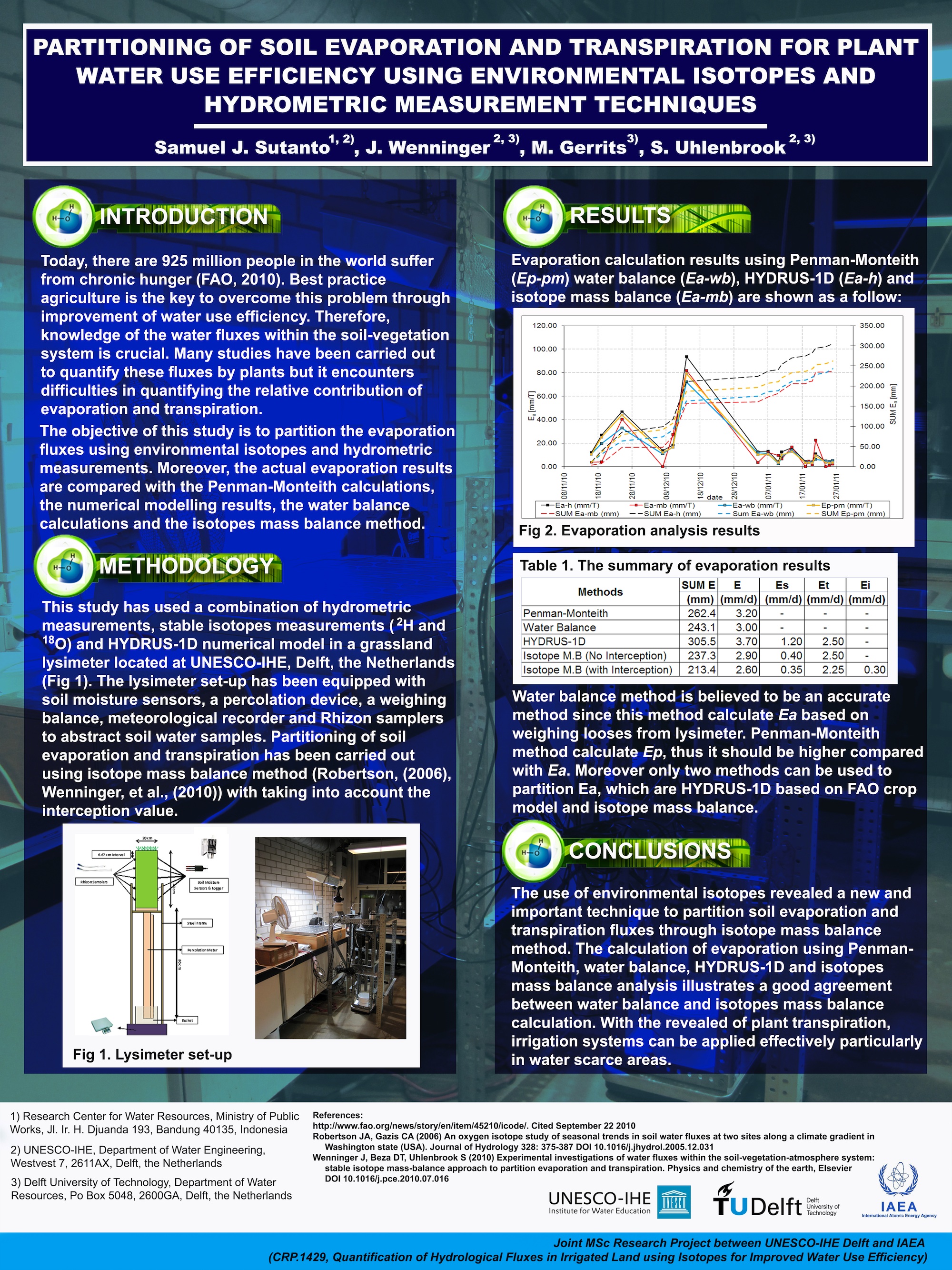 Sutanto, S.J.*, Wenninger, J., Gerrits, A.M.J. (2011): Partitioning Soil Evaporation and Transpiration for Plant Water Use Efficiency using Hydrometric Measurements and Stable Isotope Techniques. Water for Food Conference, Lincoln, Nebraska. Poster